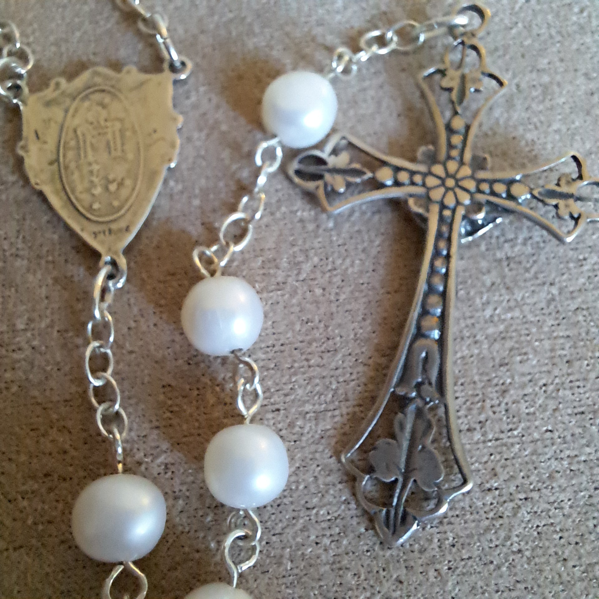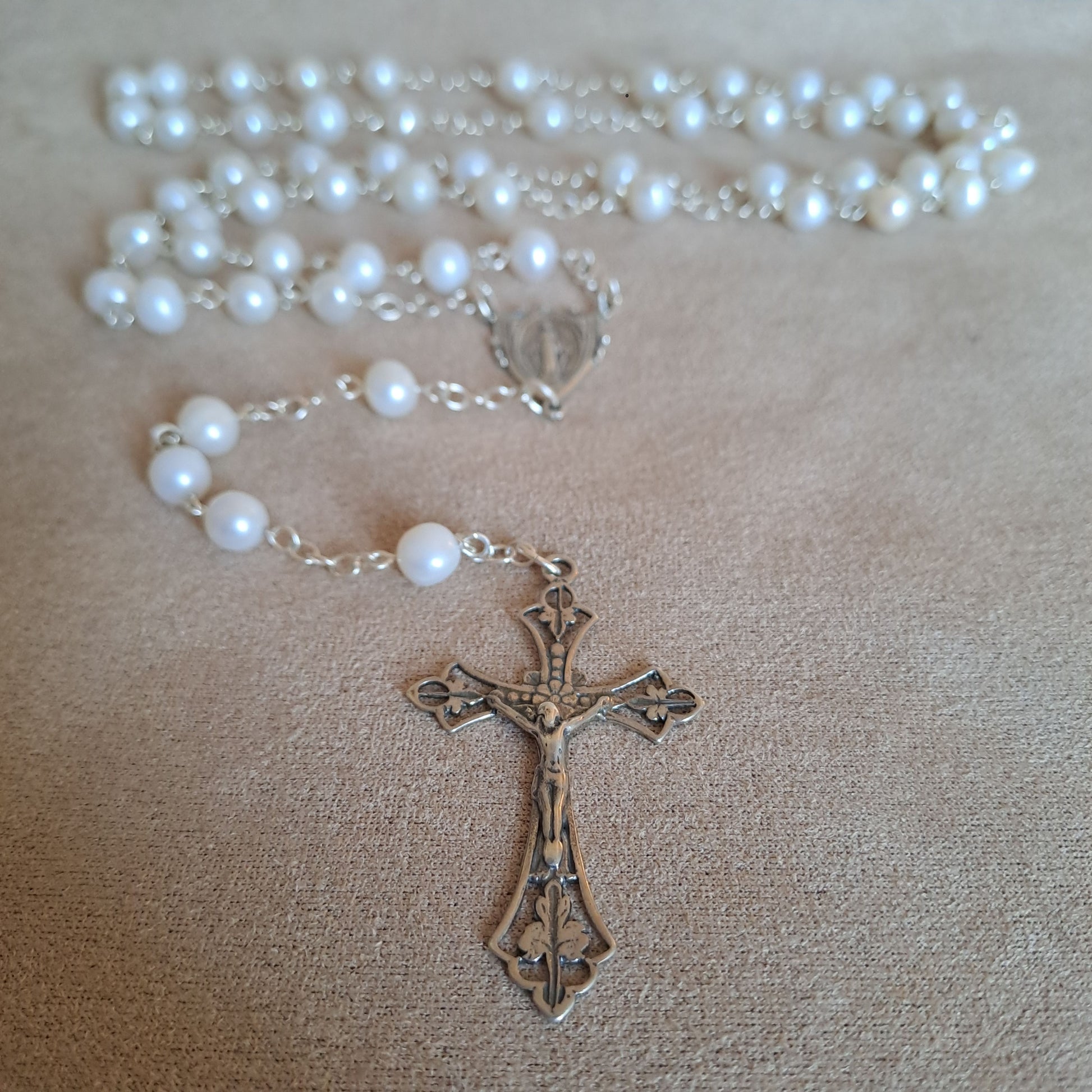 En mycket vacker, elegant och tidlös rosenkrans, handgjord av äkta sötvattenspärlor (ca 6 mm) sammanfogade med kedja och detaljer i 100 % sterling silver (925).