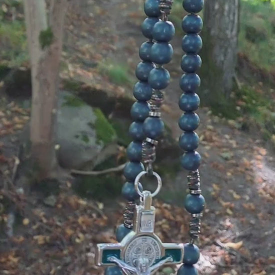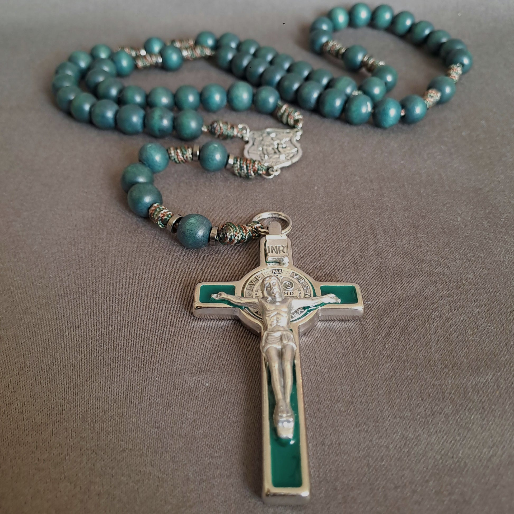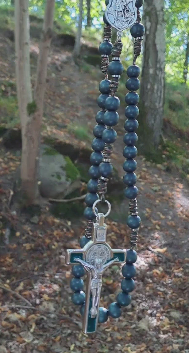Rosenkransen är försedd med ett rejält Benedictus-krucifix med grön emalj – en kraftfull symbol för beskydd mot ondska och frestelser. I centrum sitter en medalj föreställande ärkeängeln Mikael, kyrkans himmelske försvarare och krigare (Upp. 12:7). Den slitstarka paracord-tråden gör rosenkransen mycket tålig för dagligt bruk och långa pilgrimsvandringar.